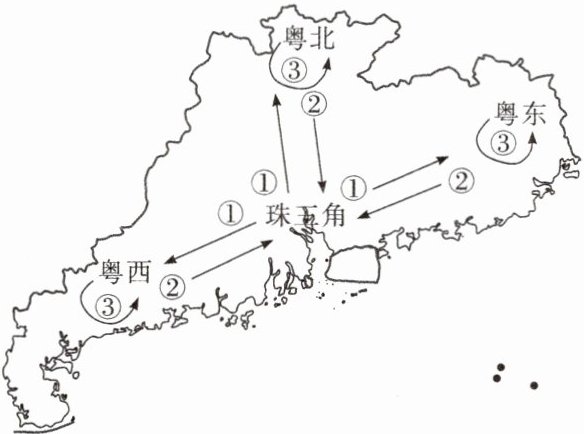“双转移”工作促进广东区域经济协调发展。读广东省产业转移和劳动力转移方向示意图,完成12~13题。