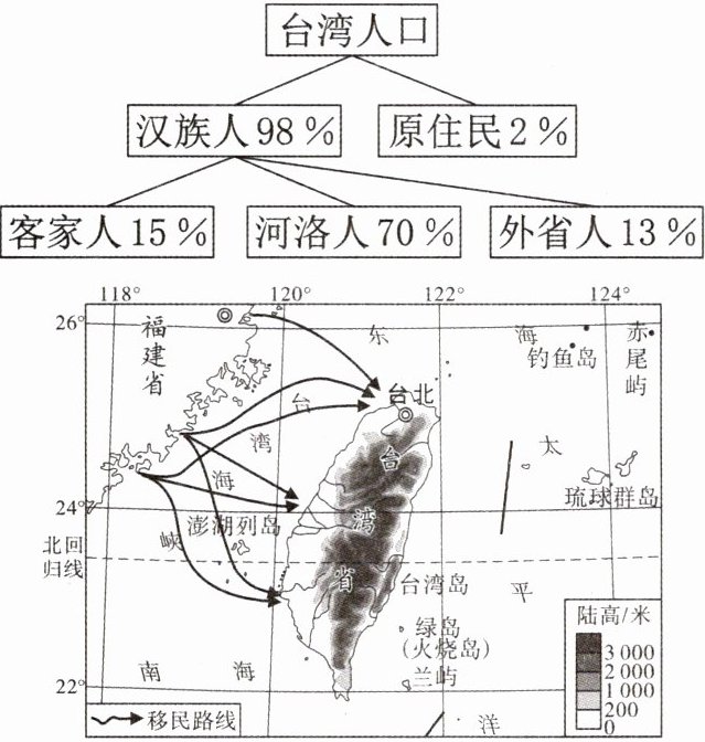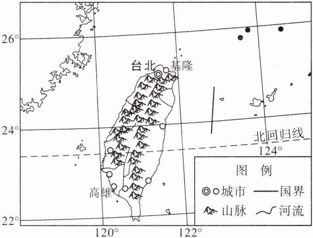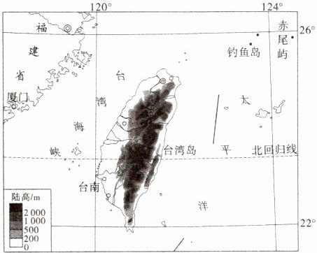 台湾岛上的风光,可以用“山高、林密、水多、岸奇”来概括。读台湾岛略图,完成7~8题。