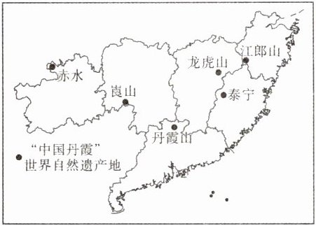 “中国丹霞”是我国第8项世界自然遗产,由泰宁、崀山、丹霞山、龙虎山、江郎山和赤水6个提名地组成。读“中国丹霞”世界自然遗产地分布示意图,完成7~8题。