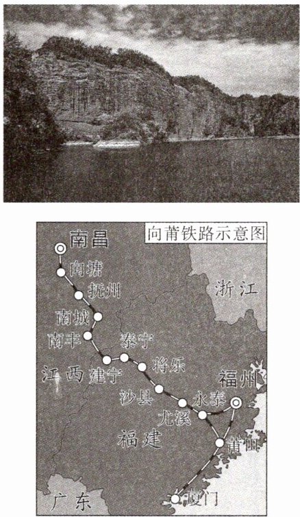 9. 读泰宁县国家地质公园图和向莆铁路示意图,回答下列问题。