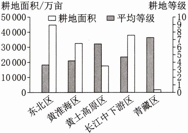 如图为我国部分区域耕地面积及平均等级结构图,耕地等级数值越小,表示耕地质量越优。读图,完成8~9题。