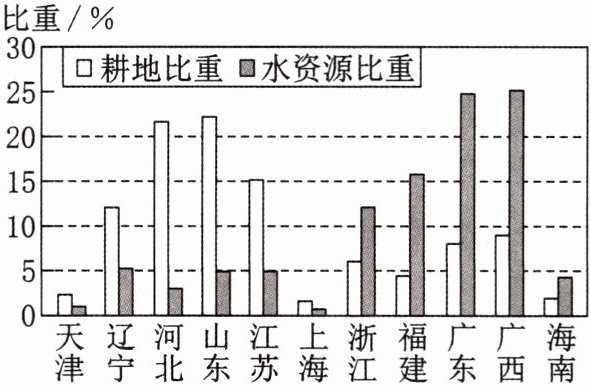 11. 如图为中国东部沿海省(市)区耕地、水资源比重对比图。由图可知( )