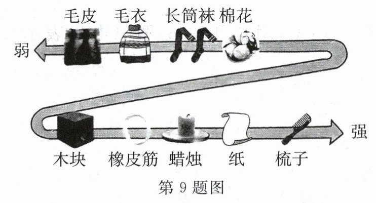 9. 如图所示为部分不同物质的原子核对电子束缚能力强弱的排序图,毛皮与图中的________摩擦最容易起电,且摩擦后毛皮带________(选填“正”或“负”)电。