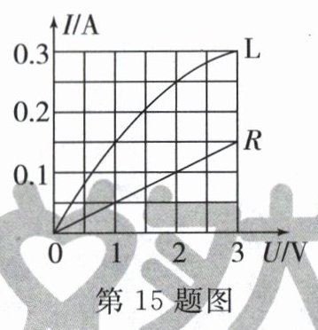 15. 如图是小灯泡L和电阻R中的电流随电压变化的图象。由图象可知,电阻R的阻值为________ Ω。现将小灯泡L和电阻R串联在电路中,当电阻R两端电压为3 V时,小灯泡L消耗的功率是________ W。