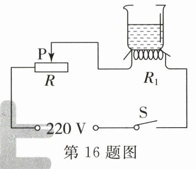 16. 在科技节上,小明自己动手制作了一个牛奶加热器,设计电路如图所示,已知滑动变阻器R的最大阻值为100 Ω,用于加热的电阻丝R₁的阻值为55 Ω。闭合开关S后,求:
