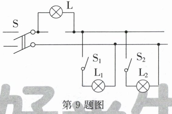 9. 家里某用电器发生短路,保险丝立即熔断,用下列方法进行检测,如图所示,断开所有用电器的开关,用一个普通的白炽灯L作为“校验灯”,与熔断的保险丝并联,然后只闭合S、S1,若L正常发光,说明L1_______;只闭合S、S2,若L发出暗红色的光(发光不正常),说明L2_______(选填“正常”“短路”或“断路”)。生活中要注意用电安全,通常人体安全电压不高于_______V。
