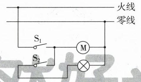 19. 如图所示,只闭合开关S₁,风扇M工作;只闭合开关S₂,灯泡和风扇M都不工作;同时闭合开关S₁、S₂,灯泡和风扇M都工作。请把电路连接完整。