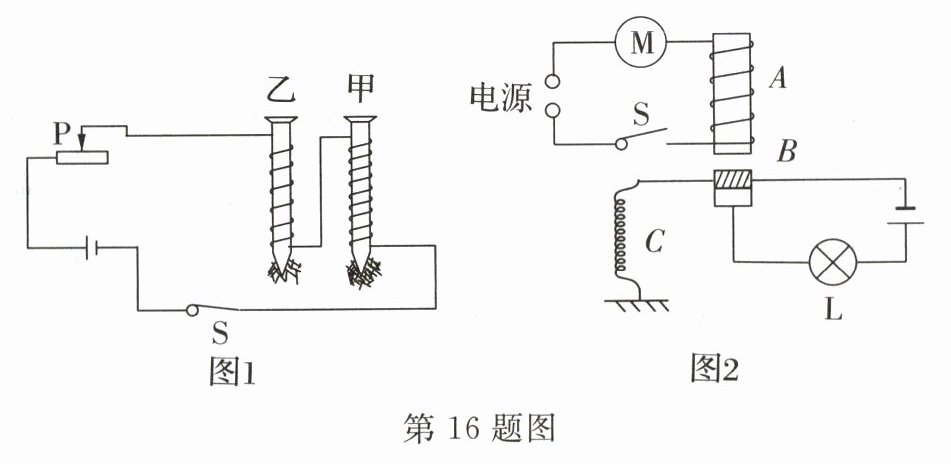 16. 在探究“影响电磁铁磁性强弱的因素”实验中,小明制成简易电磁铁甲、乙,并设计了如图1所示的电路,甲、乙各吸引部分大头针。
