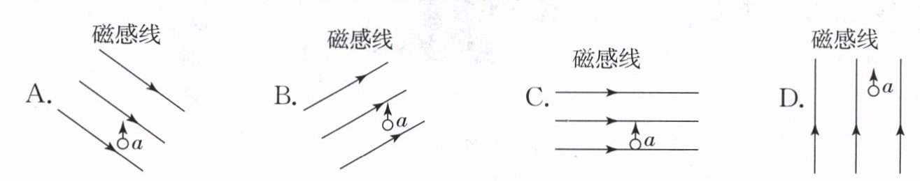 5. 图中的a表示垂直于纸面的一段导线,它是闭合电路的一部分,当a在下列磁场中沿图中所示方向运动时,不会产生感应电流的是( )