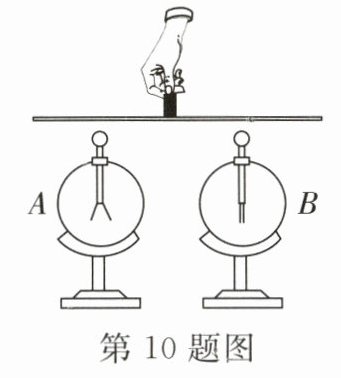 10. 如图所示,两个相同的验电器A和B,A带负电,B不带电。若用金属棒把A和B连接起来的瞬间,金属棒中的电流方向从________(选填“A到B”或“B到A”);若用橡胶棒连接两验电器,验电器B的金属箔片将不会张开,是因为橡胶棒是________体,它不易导电。