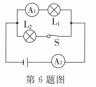 7. 在如图所示的电路中,开关闭合后,电流表A₁、A₂、A₃的示数分别为6A、5A、9A,则通过灯泡L₁的电流为_______A,通过灯泡L₂的电流为_______A。