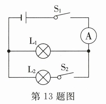 13. 如图所示,当开关S₁闭合时,电流表的示数是0.3A,再闭合开关S₂时,电流表的示数变化了0.3A,则通过灯泡L₁的电流是_______A,通过灯泡L₂的电流是_______A。