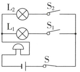 15. 某科技小组为医院病房设计了呼叫电路,在病人需要护理时,闭合床头开关S₁或S₂,护士值班室的护士就能及时看到对应的灯L₁或L₂亮,同时听到电铃响起。请用笔画线代替导线在图中连接符合设计要求的电路图。