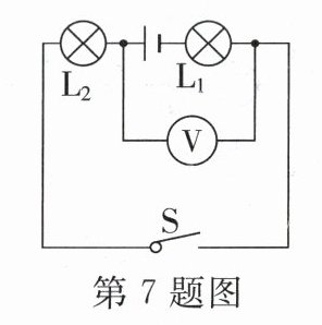 7. 某同学连接的电路如图所示,他所用的电源是四节新干电池串联组成的电池组,当他将开关闭合后,电压表的示数为2V,则L₁两端的电压为_______,L₂两端的电压为_______。