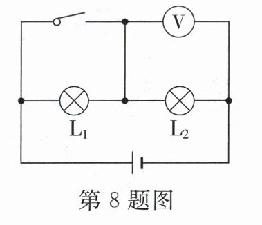 8. 如图所示,开关闭合后,电压表的示数为6V,开关断开后,电压表的示数为4V。如果电源电压不变,则电源电压为_______V,开关断开后L₁两端的电压为_______V。