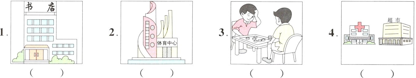 1. What is the young man doing in the garden?2. I often play chess with my father.3. There is a sports centre here.4. What's that red building?