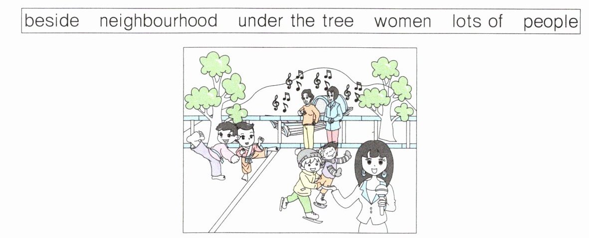 1.people 2.women 3.Beside 4.under the tree 5.lots of 6.neighbourhood
