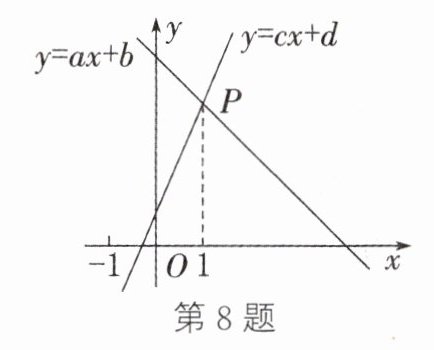 8.如图,一次函数y = ax + b(a≠0)与y = cx + d(c≠0)的图象交于点P.有下列结论:①d<0;②ab<0;③a + b = c + d;④关于x的不等式ax + b>cx + d的解集为x<1.其中,正确的是________(填序号).