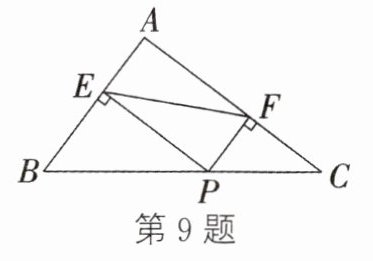 9. 如图,在△ABC中,AB = 6,AC = 8,BC = 10,P为边BC上一动点(不与点B、C重合),PE⊥AB于点E,PF⊥AC于点F,则EF长的最小值为__________.