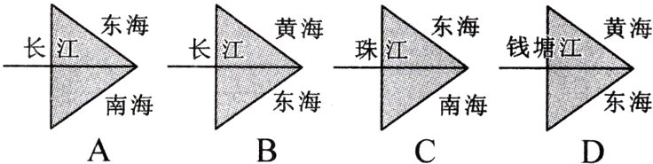 2. 长江三角洲区域濒江临海,地处江海交汇之地。下列描述其位置的图示正确的是 ( )