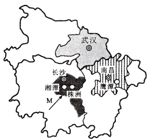 读“长江中游城市群简略示意图”,回答内部的差异与联系1−2题。