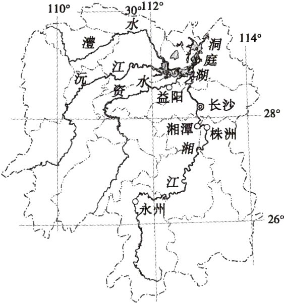 (永州市中考)湘江是湖南的“母亲河”,湘江流域聚焦了湖南60%的人口,也聚焦了许多城市。读“湖南省略图”并结合所学知识,完成13−14题。