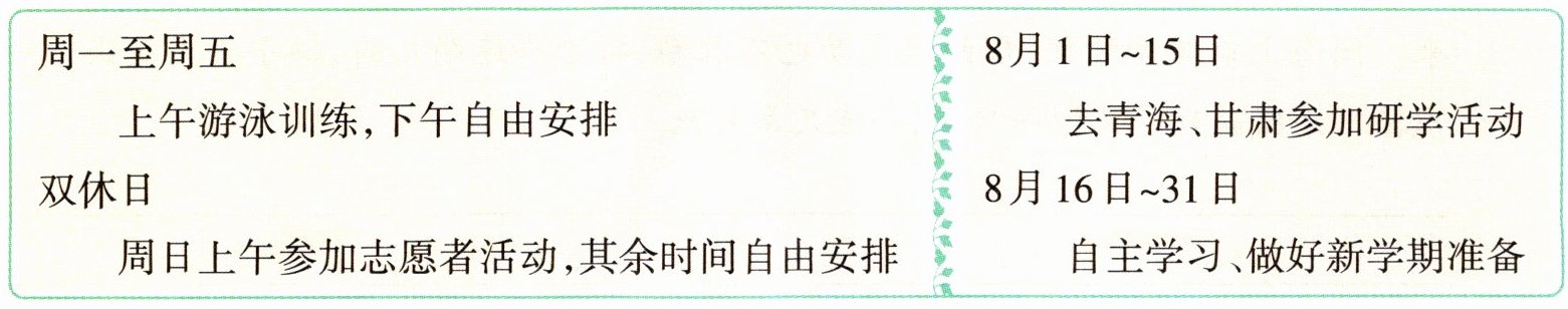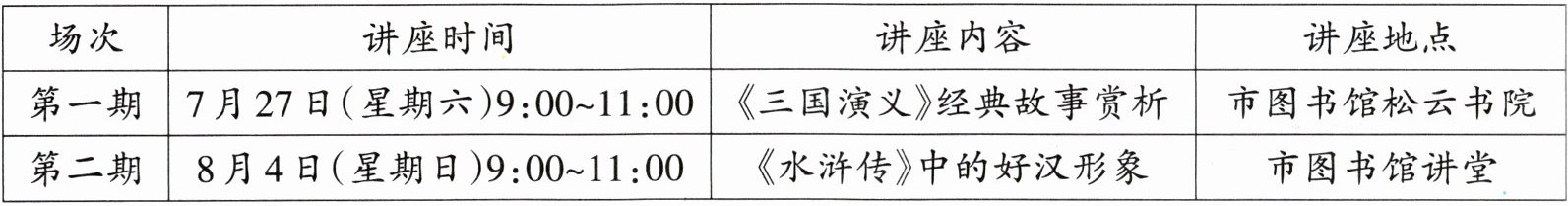 2. 亮亮是该市五年级的学生,他非常喜欢四大名著,很想参与这次活动。以下是他的暑假安排,他可以去______________听第______期的讲座。