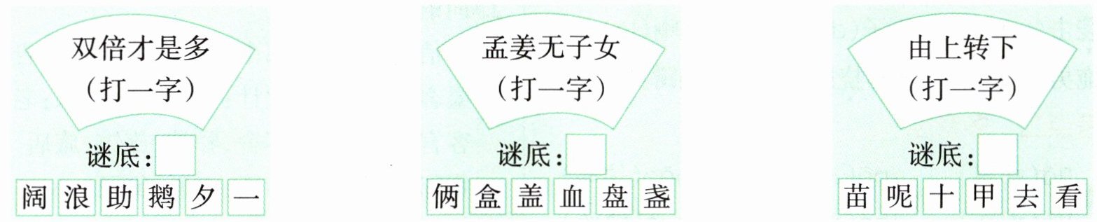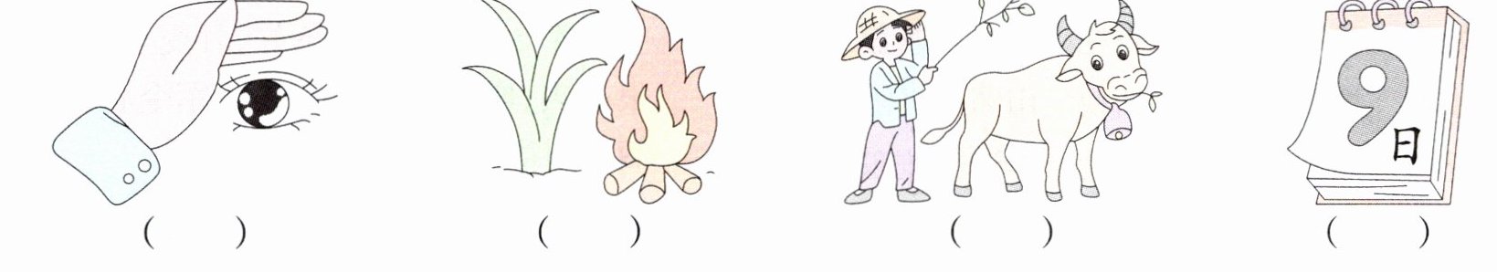 看 秋 件 旭 解析:本题考查看图猜字谜的能力。第一幅图,手遮在眼睛上面表示“看”;第二幅图,禾苗和火一起构成“秋”;第三幅图,“一人一牛”是“件”;第四幅图,日历显示的是“九日”,合在一起就是“旭”。