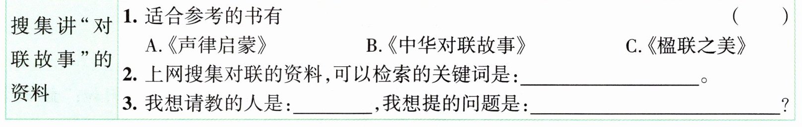 解析:本题涵盖搜集资料的三种具体方法:查找图书、网络搜索、请教别人。查找图书时,根据“对联故事”这一主题,从书名看,B项《中华对联故事》最为适合,而A项和C项更侧重于介绍对联知识,可能不太合适。在网上搜索资料,关键词很重要,搜集对联故事,可以检索关键词“对联故事”。请教别人时,要先想想谁可能会有自己需要的资料,比如,语文老师、对联研究专家等。提的问题要和“对联故事”的主题有关。