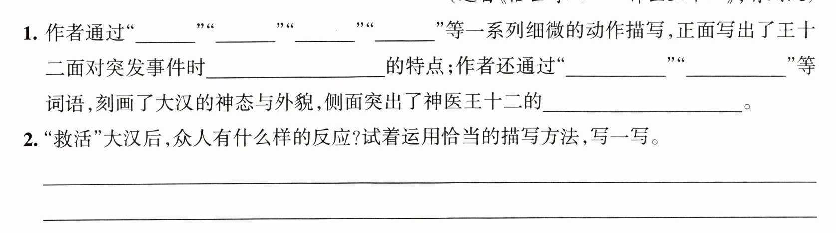 解析:仔细阅读短文后,我们能够找到“跑到大汉身前、搂大汉的腰、往大汉脸上一捂、手一松”等词句,题目要求填的是动词,所以在这里填入“跑、搂、捂、松”四个动词。从这一系列行云流水的动作中,我们能感受到王十二应对突发事件时的沉着冷静、处变不惊。大汉在王十二医治之时,神态和外貌发生了巨大变化,其中,“憋得红头涨脸”属于神态描写,“胸膛就鼓起来”属于外貌描写,这从侧面突出了王十二的医术高明。