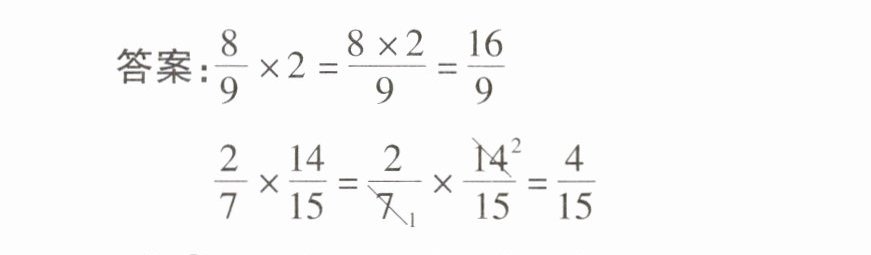 例:计算$\frac{8}{9} \times 2$和$\frac{2}{7} \times \frac{14}{15}$。