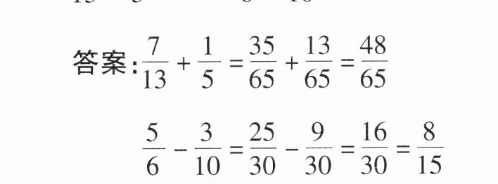 $\frac{7}{13}+\frac{1}{5}$ $\frac{5}{6}-\frac{3}{10}$
