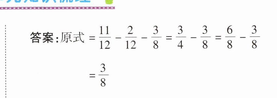例:简便计算:$\frac{11}{12}-(\frac{1}{6}+\frac{3}{8})$。