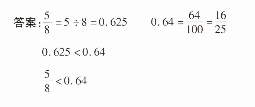例:将$\frac{5}{8}$化成小数,0.64化成分数,并比较它们的大小。