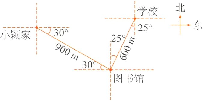小颖从家先向东偏南30°方向走900m到图书馆,再向北偏东25°方向走600m到学校。解析:描述路线图时,要按照行走的顺序,依次说出从一个地方到另一个地方行走的方向和距离,根据地点的变化明确不同的观测点,看清图示中的实际距离。