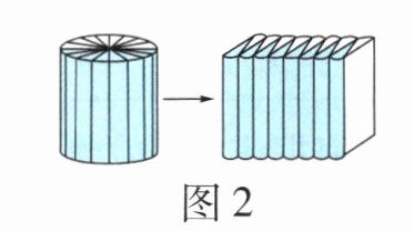 (2) 把一个底面半径是 4 cm 的圆柱按图 2 的方式切开,拼成一个近似的长方体,表面积增加了 80$cm^{2}$,圆柱的高是( )cm。
