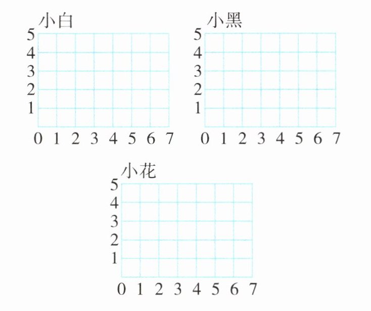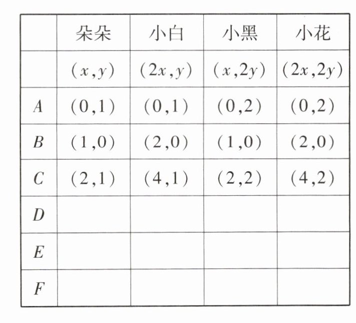 (2)与朵朵相比,表示小白轮廓的点的数对是第一个数( ),第二个数( );表示小黑轮廓的点的数对是第一个数( ),第二个数( );表示小花轮廓的点的数对是第一个数( ),第二个数( )。(填“乘2”或“不变”)
