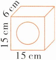 4. 如图是一个长、宽、高分别是15 cm、6 cm、15 cm的长方体钢制机器零件,中间有一个底面半径为5 cm的圆柱形空洞,求这个零件的体积。