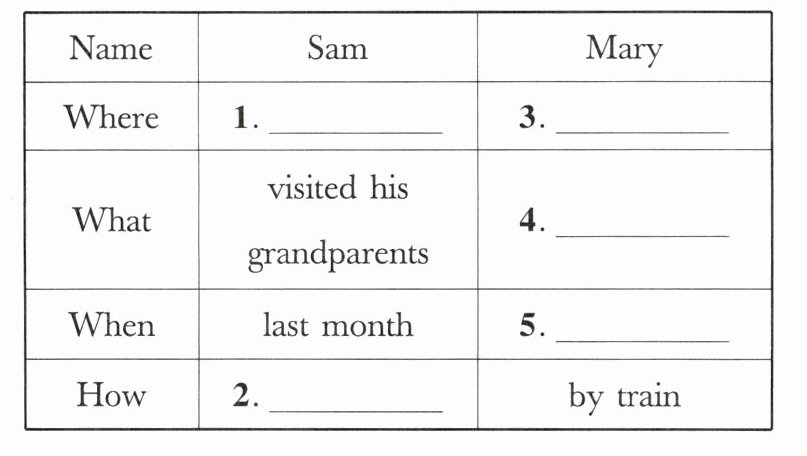 Sam:I went to the USA by plane with my parents last month. I visited my grandparents. I was so excited.