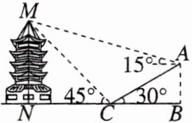 13. 如图,为测量某塔的高度,在地面上选择一个观测点C,在C处测得A处的无人机和塔顶M的仰角分别为30°,45°.无人机距地面的高度AB为45米,且在A处无人机测得点M的仰角为15°,点B,C,N在同一条直线上,则该塔的高度MN为________米.