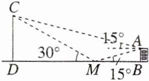 14. 如图,某同学为了测量学校天文台$CD$的高度,在学校宿舍楼三楼一阳台$A$处测得$A$到地面的距离$AB$为$30(2-\sqrt{3})\text{m}$,在天文台与宿舍楼之间的地面上一点$M$处测得阳台$A$,天文台顶$C$的仰角分别是$15^{\circ}$和$30^{\circ}$,在阳台$A$处测得天文台顶$C$的仰角为$15^{\circ}$,假设$AB$,$CD$和点$M$在同一平面内,则学校天文台$CD$的高度为_______$\text{m}$.