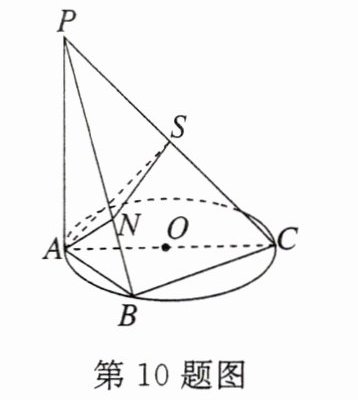 10. 如图,AC为圆O的直径,∠PCA = 45°,PA垂直于圆O所在的平面,B为圆周上不与点A,C重合的点,AS⊥PC交PC于点S,AN⊥PB交PB于点N,则下列说法正确的是 ( )
