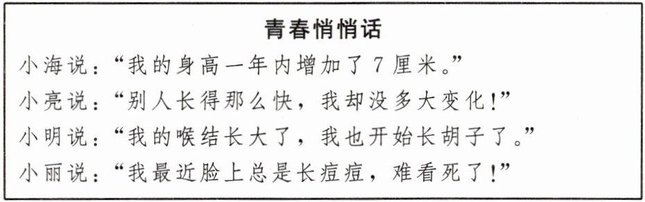 七年级某班同学在“青春悄悄话”主题班会中描述了自己的变化。据此回答1、2题。