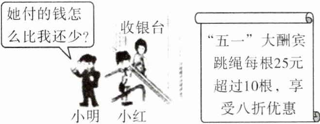 (2)设小红购买跳绳$x$根$(x>10)$,则小明购买跳绳$(x - 2)$根.根据题意,得$25×0.8x = 25(x - 2)-5$. 解得$x = 11$.