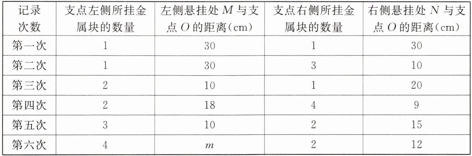 如图1,小亮用一根两端贴有完全相同的薄防滑片的轻质直杆和6个质量相等的小金属块做实验(防滑片的作用是防止悬挂物从直杆两端滑落,直杆和防滑片的质量忽略不计);已知直杆AB长为60 cm,以AB的中点O为支点,在此处拴绳,将直杆吊起.在支点O两侧各悬挂一定数量的小金属块,分别在线段OA,OB上调整悬挂的位置,使得直杆保持水平平衡,分别记录此时两侧悬挂处M,N与支点的距离,以及两处所挂的小金属块的数量.然后,改变小金属块的数量,重复以上操作.小亮在实验过程中记录的数据如下:
