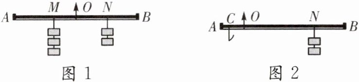 (2)小亮依据上述实验中发现的规律,利用实验中的直杆AB和小金属块制作了一把简易杆秤(如图2),在距离A端4 cm的C处装了一个用来悬挂被称物体的小挂钩(挂钩的质量忽略不计),将支点O设在距离A端12 cm处,用两个小金属块作为秤砣(每个小金属块的质量均为0.2千克).