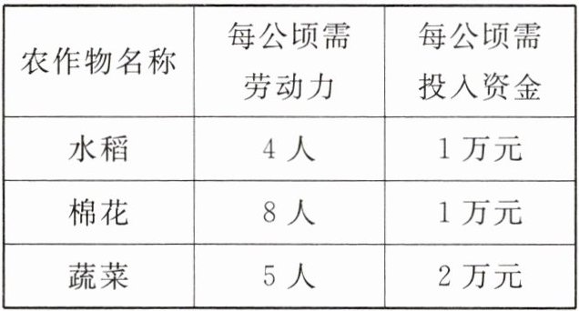 9.某农场300名职工耕种51公顷土地,计划种植水稻、棉花和蔬菜,已知种植农作物所需的劳动力(人数)及投入的设备资金如下表: