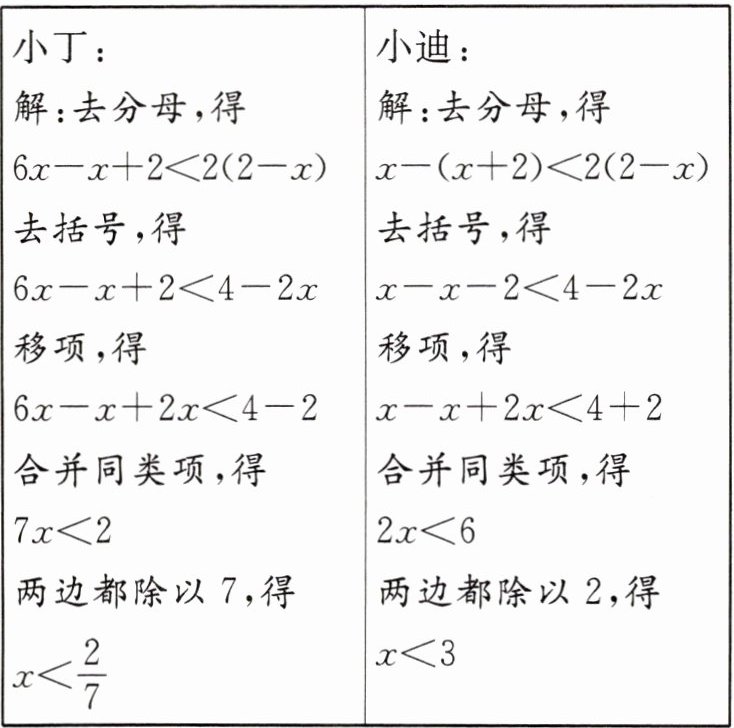 9.(2024·浙江模拟)小丁和小迪分别解不等式$x-\frac{x + 2}{6}<\frac{2 - x}{3}$的过程如表: