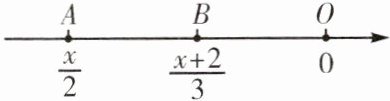 10. 如图,$A$,$B$为数轴上的两点,$O$为原点,点$A$,$B$表示的数分别是$\frac{x}{2}$,$\frac{x + 2}{3}$.若$B$,$O$两点之间的距离等于$A$,$B$两点之间的距离,则$x$的值是______.