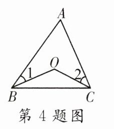 4. 如图,∠1 + ∠2 = 70°。若∠A = 60°,则∠BOC的度数为________。